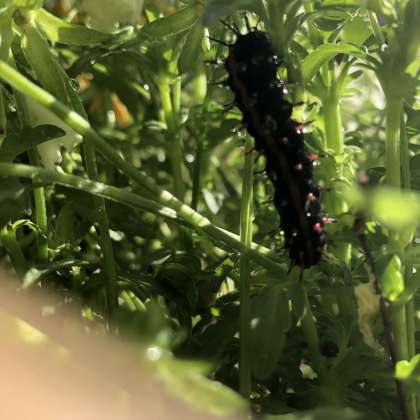 すると,黒くてピンクのトゲがあるよう虫がパンジーのプランターにいました。