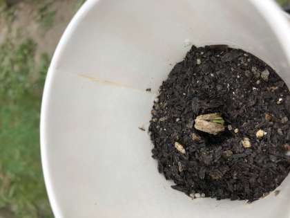 昨日土の中からツルレイシの種が顔をのぞかせていましたが,今日見てみると種の中からみどり色が見えました。いったいこれは何でしょう?来週にはもっと大きくせいちょうしているといいですね!