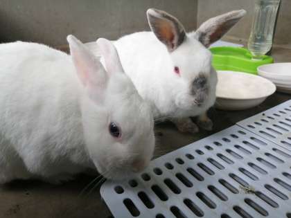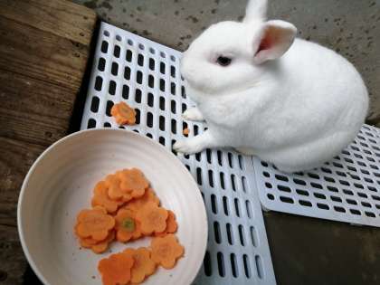 がっこうには,2わのウサギがいます。くろいめがゆきで,あかいめのほうがシャーロットです。にんじんとキャベツがだいすきで,がっこうのはたけでにんじんとキャベツをそだてています。