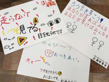 計画委員会で,ろう下を歩いてもらうためのポスターを作りました。みんなが安心して安全に生活することができるように,ろう下や階段などでは走らないように,これからも呼び掛けていこうと思います。