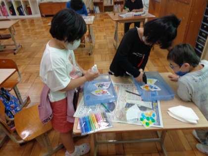 図工の時間に,にじみ絵をしました。コーヒーフィルターに水性ペンで好きな模様を描いて,霧吹きで水をかけました。色が混ざり合う様子を楽しみながら,素敵なちょうちょの絵が完成しました。