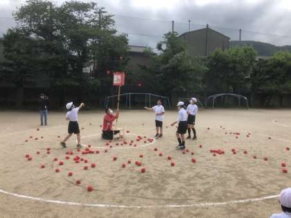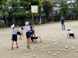 1回戦は1班ごとに1分間玉入れをしました!