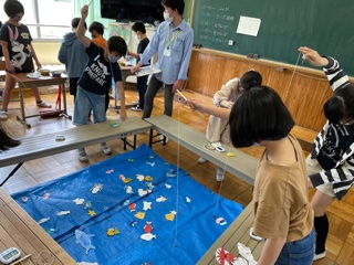 食事係は山の家の魚掴みのかわりに魚釣りゲームを準備し担当しました!