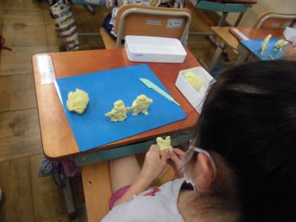 図工「いっしょにおさんぽ」の学習で,誰と一緒にお散歩に行きたいかを考え,粘土で表現しました。「たくさんの人と一緒にお散歩にいきたいな。」「さかなとお散歩したいな。」などと想像しながら,楽しんで活動していました。