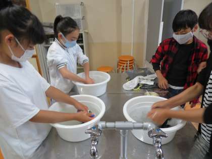 「粉状の洗剤を見たのは初めて!」という子ども達もいました。汚れに合わせてつまみ洗いをしていた子ども達。実習後には,