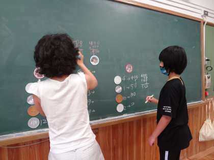 算数でお金の学習をしました。金種の弁別やお金の計算など,それぞれの課題に向かって頑張っています。高学年の児童は「50円玉が4枚で・・」と合計の金額を考えました。1・2年生は,「穴が開いているのが50円だね。」と硬貨の模型を種類ごとに,よく見てわけていました。スプーンやトングを使う練習にもなりました。