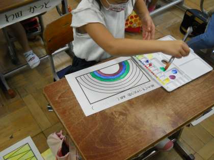 図画工作科の学習で,初めて絵の具を使いました。子どもたちは,「色がうすくなる。」や「上手にぬれない。」など,困っている様子もありましたが,楽しんで取り組んでいました。たくさん練習して,上手に色を塗れるようになってほしいです。