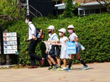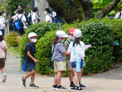 「どこから回る?」「この道から行った方が早そう!」など,グループの友だちと相談しながらクイズラリーを回っていました。全部のクイズの答えを見つけ,先生にチェックしてもらうと,「やったー!」「見つけるのが難しかったけど,みんなでがんばった。」などと嬉しそうに話してくれました。