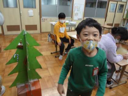 絆ペア活動で折り紙を使って,クリスマスの飾りを作りました。指先に力をこめることや,手順書を見て製作活動をすることなど,それぞれのめあてに沿って素敵な飾りつけを作ることができました。ペア活動にも慣れて,自然と教え合ったり一緒に作ったりする姿が見られました。