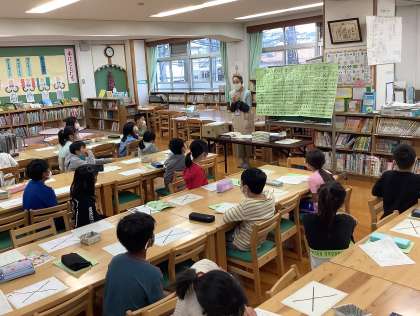 国語科「図書館の達人になろう」という学習で,図書館の工夫についての話を学校司書の吉野先生にしてもらいました。探したい本が見つけやすいように,本にラベルが貼られていたり案内図があったりすることをわかりやすく教えてもらいました。これから探したい本を見つけるのが早くなりそうです。