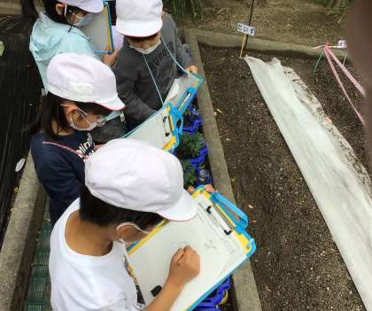 ついに大豆の芽が出てきました。子どもたちは,芽が出てくる日をとても楽しみに待っていました。これから大豆とホウセンカを観察していき,成長の様子を見ていきます。色・形・大きさなどの特徴をとらえながら,観察カードを書いています。