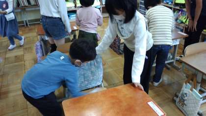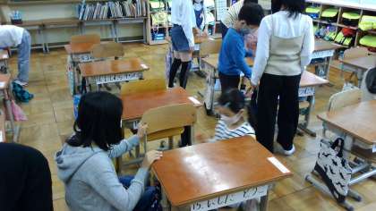 小学校で初めての掃除でした。6年生に教わりながら,机やいすをぞうきんで拭きました。ぞうきんをしっかりと搾り,たたんで丁寧に拭いていました。これからほうきやちりとりの使い方も学んでいきます。