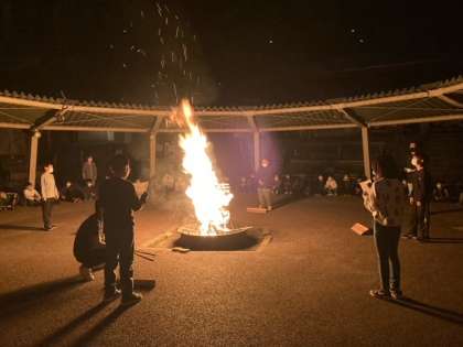 レク係が中心となり,キャンプファイヤーをしました。1つの火を囲んでゲームをしたり歌ったりする中で,仲間の良さを感じ,楽しい思い出を心に焼き付けています。嬉しそうな笑顔と歌声が広がり,とても和やかな時間でした。
