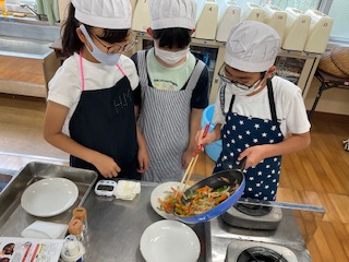 いろどりよくきれいに盛り付けることができました!みんなの様子を見に来てくれた先生方にも試食してもらい「おいしい!」の言葉をいただきました。ピーマンのシャキシャキ食感やしんなりしたにんじんの甘味がわかる程度の味付けで,とても美味しかったです!!