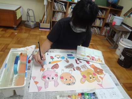 図工の時間に「くまちゃんが小さくなっちゃった」という絵本を読んで、くまちゃんと遊んでいる様子を想像しながら描きました。「お菓子パーティをしているところ!」「プールのビート板に乗せて泳ぐところ」などいろいろな場面を考えて描くことができました。