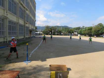 『ベースボール型ボールゲーム』では、チームで打つ方向や守る場所を相談しながら活動しています。チームの子が打つと、「ナイス!いける!いける!」と声をかけている子ども達。これからもチーム力をあげながら取り組んでいきます☆