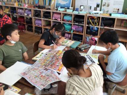 みんなが住んでいる地域には、どこから品物が運ばれてくるのかをチラシや食品シールを使って調べました。「オーストラリア産のお肉があるよ!」「野菜はどれも日本から運ばれているね。」などいろんなことを知りました。グループで楽しそうに話し合っている姿がとても印象的でした。