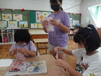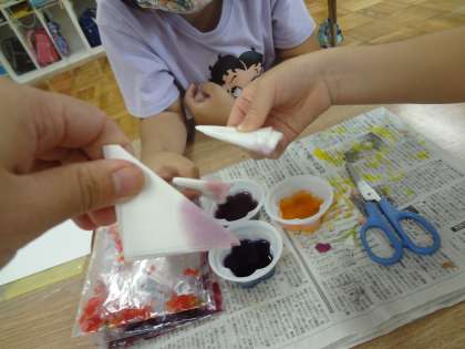 生活単元の時間に、アサガオの花を使って折り染めをしました。たくさん咲いたアサガオを色ごとに分けて、色水を作りました。和紙を折って、色のにじむ様子を楽しみながら染め紙をすることができました。
