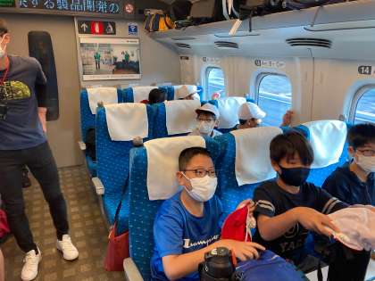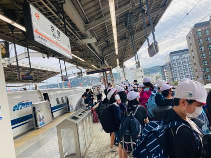 山科駅からの電車は満員でしたが、全員でマナーを守って乗ることができ、無事に新幹線に乗ることができました。広島に向けて、新幹線の旅を楽しんでいます。暑すぎず心地よい気候で、車窓からの景色もきれいです。