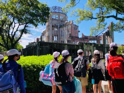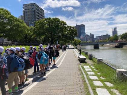 今までの平和学習を思い出しながら、原爆ドームの見学をしています。「近くで見ると思ったより大きかった。」「鉄骨だから残ったのかな。」それぞれの感想を話しながら、見学をしています。