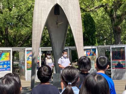 平和の子の像の下で、平和集会を行いました。それぞれの平和への願いを込めて、丁寧に折った折り鶴を奉納し、代表の児童が未来への誓いの言葉を伝えました。