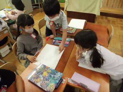 係ごとに集まって遊びの計画を立てたり、ぬり絵やめいろを作ったり、お誕生日のお友達にカードを作ったりとそれぞれに学級全体が楽しくなるようなことを考えて取り組んでいました。