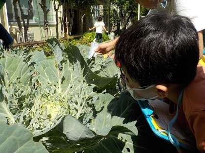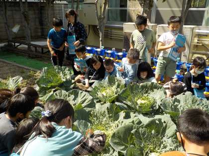 理科ではもう一つ、こん虫の育ち方も観察しています。学校園のキャベツにたくさんのたまごをうみつけていたモンシロチョウ。すくすくと成長して幼虫やサナギになっています。この後、どのように成長していくのでしょう?