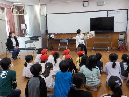 地域の方による読み聞かせの会を行いました。本の読み聞かせを楽しみにしていた子どもたちが集まり、今日は2冊の本を読んでもらいました。今回の読み聞かせの会で読んでいただいた本を図書館の前に置いておきます。読み聞かせに来た人も来られなかった人も、興味のある人はぜひ手に取って読んでみてください。