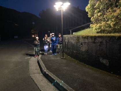 今日最後の活動は、ナイトハイクです。街灯の多い街中とは違う、大自然の暗闇や虫の声を感じながら、クラスごとにゆっくり歩きました。昼間とはまた違った景色に、ひっそりと声をかけ合う子どもたちでした。このあとロッジに戻って就寝準備です。