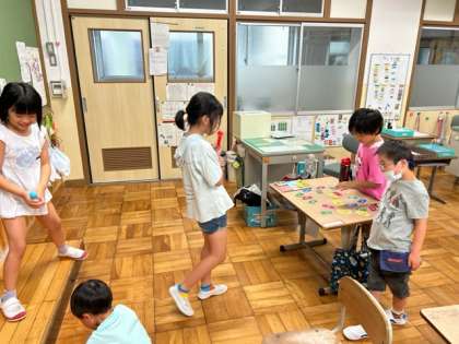 英語活動の時間に、色や数の言い方の学習をしています。さいころとカードゲームのUNOを使って、簡単なゲームをして楽しみました。いろいろな野菜の言い方や色の言い方を、楽しみながら覚えて言うことができました。