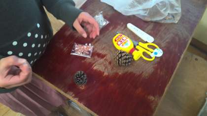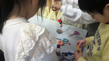 11月24日(金)、これまでで見つけた「秋のもの」を使っておもちゃや飾り作りをしました。事前に何を作りたいか、そのためにどんな材料を準備する必要があるか考えて、どんぐりのごまやでんでん太鼓、まつぼっくりを使ったコマ、落ち葉をつかったネックレスなど、とても意欲的に作ることができました。