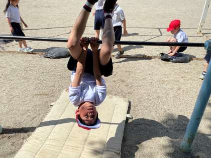 体育の学習では、みんな元気いっぱいに鉄棒をしています。たくさんの種類の技に楽しみながら挑戦しています。できる技も少しずつ増えていき、みんな鉄棒に進んで取り組みことができています。