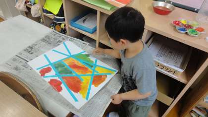 図工の時間に、マスキングテープを使っていろいろな模様を作りました。絵の具を使って丁寧に色を塗って、素敵な作品をつくることができました。