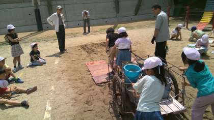 今日は、学校にあるものを使って「雨の日に牛車で荷物を運ぶこと」に近い体験をしました。ぬかるんだ道で荷物を運ぶ大変さと、車石の大切さを実感することができました。