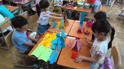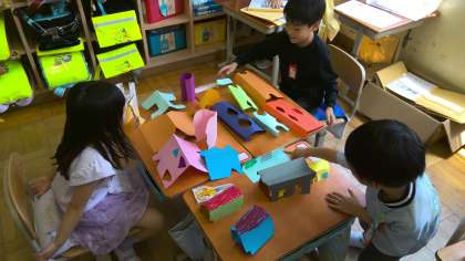 画用紙を折って、はさみで切り、おってたててみました。たくさんの動物をおって、動物園をイメージする人や電車と線路を作る人など、おもしろい作品がたくさんできました!