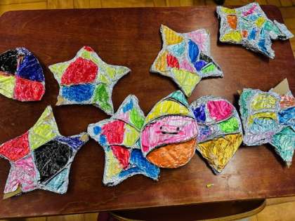 図工の時間に、段ボールとひもを使って星を作りました。ひもをテープで貼った後、アルミホイルで包んで、ペンで丁寧に塗ることができました。色鮮やかで素敵な作品を作ることができました。