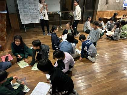 ミーティングルームで振り返りをしています。今日のテーマは「協力」でした。食事づくりからシーツの準備など、いろいろな場面で班の仲間と協力する姿が見られました。明日のテーマは「挑戦」、5年生のテーマソング「やってみよう」にもある通り、一人ひとりのいろいろなチャレンジが見られるといいなと思います。