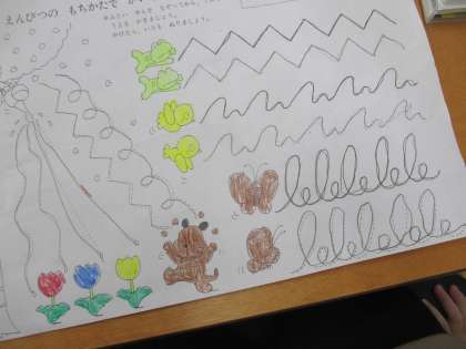 「足はぺったん・背中はピン・おなかと背中にグー1つ」の良い姿勢や、正しい鉛筆の持ち方に気をつけて取り組んでいます。