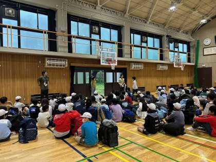 11日から13日までの3日間、5年生は花背山の家で宿泊学習を行います。体育館での出発式では、代表の児童が「みんなで楽しい思い出をつくりましょう。」と挨拶をしてくれました。