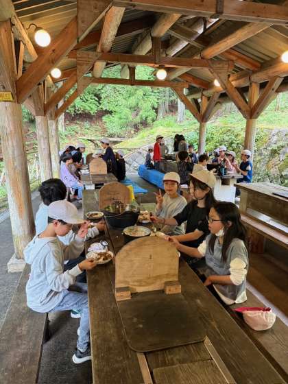 めし鍋でご飯を炊き、おかず係が切った野菜、米係が炊いたご飯、火の係が一生懸命つけた火で、美味しいカレーライスができました。みんなで協力してつくったので、美味しさがプラスされた、特別なカレーライスはとても美味しかったです。