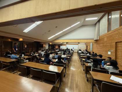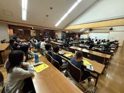 研修室で振り返りをしました。1日目のテーマ「協力・自立」でした。ふとんの準備や野外炊飯の活動の中で班の仲間と協力する姿が見られました。