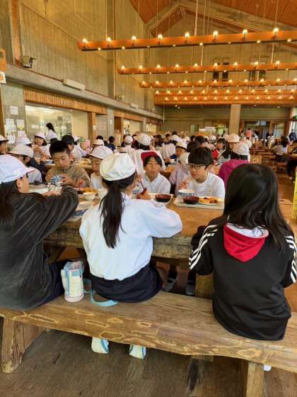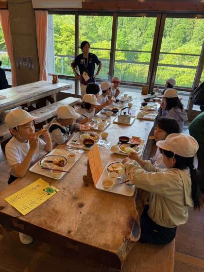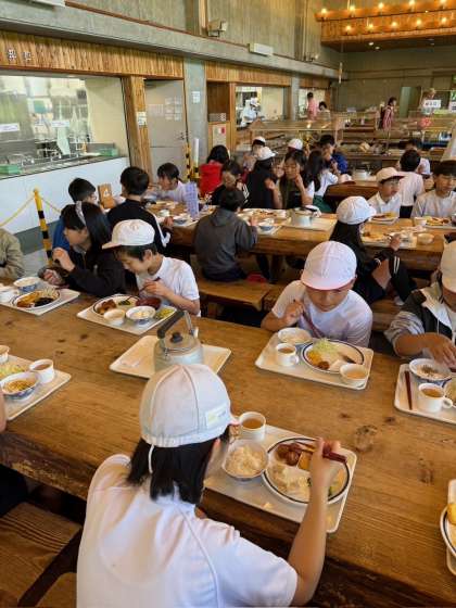3日目、花背山の家で最後の食堂利用となりました。子どもたちは、「今日で最後の食堂かぁ、もっと食べたかったなぁ」と名残惜しそうでした。朝食をしっかりと食べて、次の活動、魚掴みのためにエネルギーを充電します。