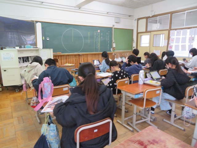 国語科では「海の命」の学習をしています。「太一」の生き方や考え方に大きな影響を与えたのは何なのかを円グラフで示し、友達と交流しました。