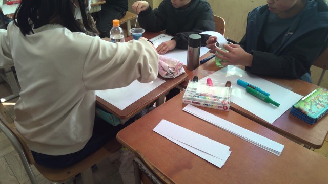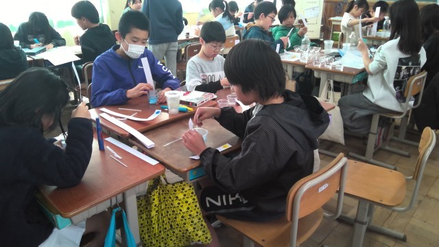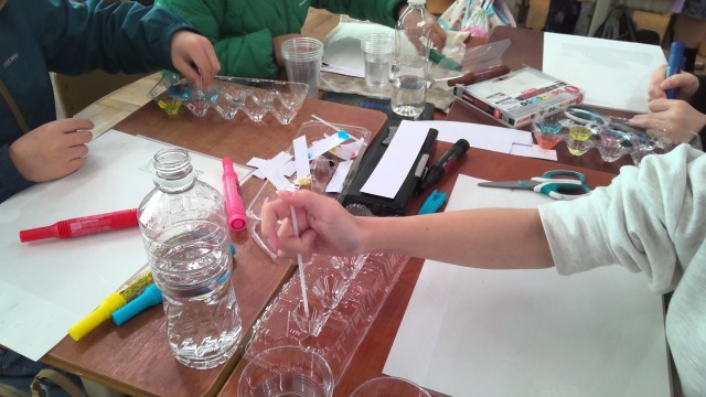 図工の学習では色のついた水を作り、好きな模様を描いたり色水を並べたりして楽しみました。どのような順番で水を並べるとよいか工夫したり、色水の濃さを試行錯誤したりしていました。友達と作品を見あいながら楽しむことができました。