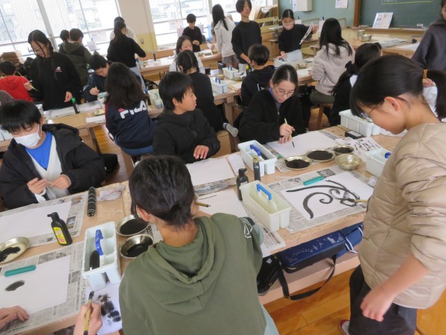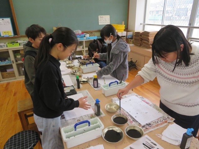 墨と水の量を変えながら、自分だけの墨絵を作りました。