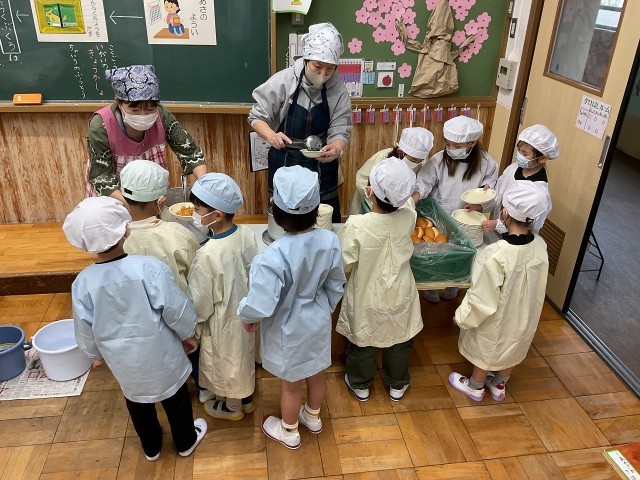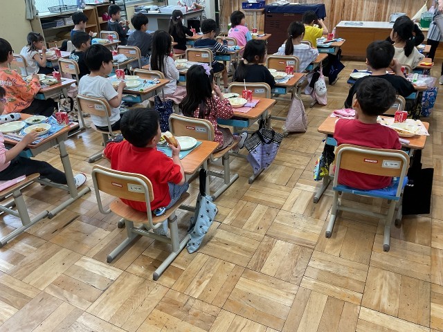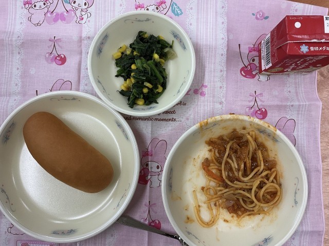 今日の献立は、スパゲッティのミートソース煮、ほうれん草のソテー、牛乳、小型コッペパン、以上です。今日は京都市立小学校のみんなが同じ献立でした。1年生にとっては、初めての給食です。