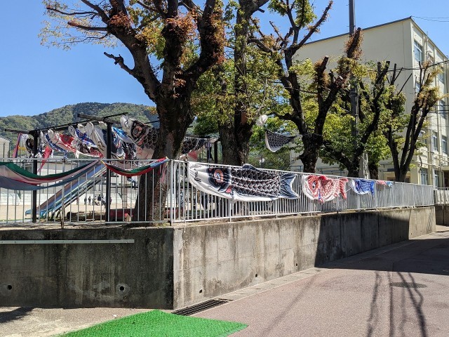 運動場の柵や藤棚に、たくさんの鯉のぼりが掲げられています。令和6年度から音羽川学区の少年補導の皆さんが、地域にある鯉のぼりを集めて設置してくださっています。