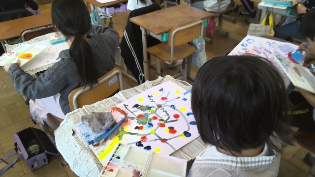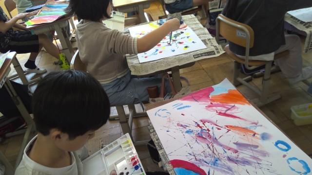 絵具をにじませたり、ビー玉を使って細い線を描いたり、様々な技法を用いて表現を楽しんでいました。