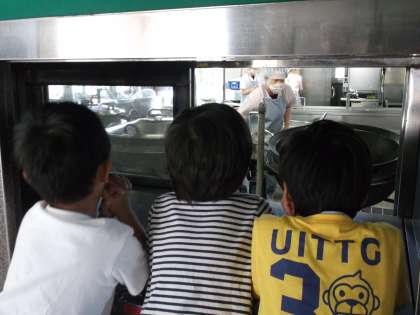 給食調理員さんが給食を作っておられるところを見せてもらいました。その日の献立の「にしんなす」を見学しました。大きなお鍋にニシンを炊き上げてあったり,調理員さんが,なすを素早く切っておられたりするところをとても興味深く見ていました。給食を支えて下さっている様子が少し分かりました。