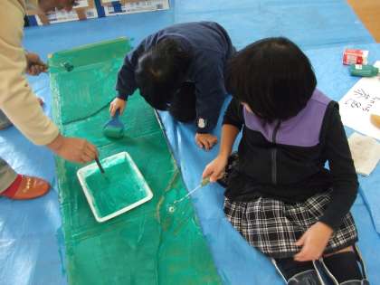 今日は「宝箱」をつくるダンボールに、色を塗りました。